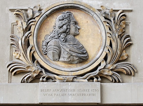 Das vom Palais Wackerbarth stammende, am Dresdner Johanneum befestigte Relief aus dem Jahr 1730 zeigt August den Starken drei Jahre vor seinem Tod.