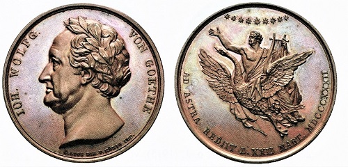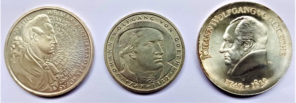 Die Sterbemedaille aus dem Jahr 1832 zeigt, wie Goethe von einem Schwan zu den Sternen getragen wird. Weiniger dramatisch geht es auf dem Fünfmarkstück von 1932 zum einhundertsten Todestag des Dichters, das zu den besonders begehrten Gedenkmünzen der Weimarer Republik gehört. Die Bundesrepublik Deutshland und die DDR ehrten Goethe mit interessanten Gedenkmünzen.