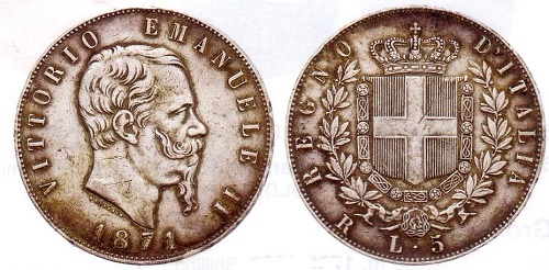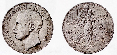 Als im Juli 1870 zwischen Preußen und Frankreich der Deutsch-Französische Krieg begann, zog der französische Kaiser Napoleon III. seine Truppen aus Rom ab, worauf Viktor Emanuel die "Ewige Stadt" angreifen ließ. Rom und der Rest des Kirchenstaates wurden am 20. September 1870 eingenommen. Mit der Proklamation Roms zur Hauptstadt vom 26. Januar 1871 und dem feierlichen Einzug des Königs endete die italienische Einigung. Der neue Staat übernahm die sardinisch-piemontesische Verfassung von 1848, die eine konstitutionell-parlamentarische Monarchie festschrieb. Italien erhielt eine zentralistische Verwaltung und wurde ähnlich wie Frankreich in Provinzen gegliedert. Der Herrschaftsbereich des Papstes war nur noch auf einen winzigen Rest rund um die Peterskirche beschränkt. Die Münzen des vereinigten Italien glichen im Wesentlichen denen, die Vittorio Emanuele II. für Sardinien hatte prägen lassen. Dass Italien nach langen Kämpfen Kleinstaaterei überwunden hatte, war dem König die Prägung von Sondermünzen nicht wert. Erst unter Vittorio Emanuele III. wurden 1911 solche mit allegorischen Figuren geschmückte Gedenkstücke aus Gold, Silber und Bronze zur Fünfzigjahrfeier der italienischen Einigung hergestellt.