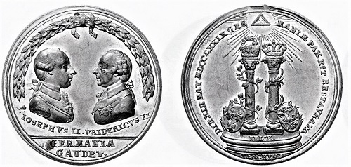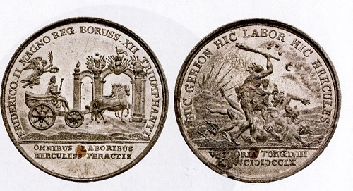Die Zinnmedaillen mit Kupferstift feiern den Sieg des auf einem Streitwagen daher kommenden und von einer Viktoria bekränzten Königs Friedrich II. von Preußen in der Schlacht von Torgau 1760 und den 1770 zwischen ihm und Kaiser Joseph II. nach dem Bayerischen Erbfolgekrieg geschlossenen Frieden von Teschen.