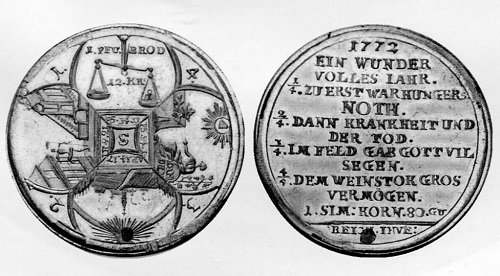 Die Zinnmedaille mit Kupferstift nimmt das angeblich wunderbare Jahr 1772 aufs Korn, das Hunger und Not und Krankheit und Tod, aber auch eine gute Ernte brachte.