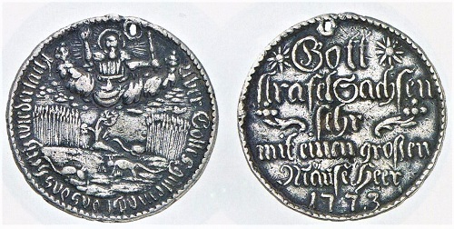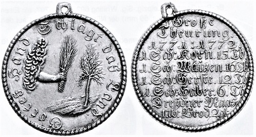 Die wenig kunstvoll gestalteten Zinnmedaillen von 1772 und 1773 erinnern an Huger und Not und an eine Mäuseplage in Sachsen, der 1773 große Teile der Ernte zum Opfer fielen. Henkel und Loch deuten an, dass man die Gussmedaillen am Band um den Hals tragen konnte.