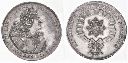 Erwähnt sei zum Schluss ein Ordenstaler, der seinem angeblichen Urheber viel Ärger bereitete und für Legenden gut war - der sogenannte Beichlingsche Ordenstaler von 1702. Diese hochwertige Silbermünze zeigt das gekrönte Monogramm Augusts des Starken und das königlich-polnische und kursächsische Allianzwappen. Die in Leipzig geprägte Münze gehört zu einer Serie von drei mit den Zeichen des dänischen Elefantenordens geschmückten sogenannten Banco- oder Kreuztalern, deren Emission auf eine Idee des Großkanzlers Graf Wolf Dietrich von Beichlingen zurückgehen soll. Einer dieser Taler bildet den mit einem Kreuz belegten Stern des dänischen Elefantenordens ab. August dem Starken indes wurde eingeflüstert, das Ordenszeichen sei das des dänischen Danebrogordens, dessen Ritter Graf von Beichlingen war. Die "die Majestät beleidigende Herausnehmung" spielte in dem Verfahren eine Rolle, das gegen den schon bald in Ungnade gefallenen und auf die Festung Königstein geschickten Grafen angestrengt wurde. In seiner Verteidigungsschrift hat Beichlingen jede Schuld von sich gewiesen und erklärt, dass sich die Ordenskreuze des Elefanten- und des Danebrogordens ähneln.