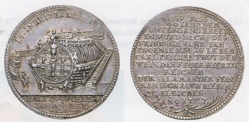Doch nicht nur solch grausige Geschichten erwährt man in der nach der Corona-Pandemie nun wieder zum Leben erwachten ehemaligen Residenzstadt, sondern auch was es mit dem berühmten Heidelberger Fass auf sich hat, von dem in der Barockzeit verschiedene Medaillen hergestellt wurden. Eine Prägung von 1727 zeigt nicht nur die Ansicht des über 200 000 Liter fassenden, reich mit Figuren geschmückten Weinbehälters, sondern lobt auch Kurfürst Carl Philipp, der das Fass "nach des Feinds Gefahr" wie Phoenix aus der Asche aufsteigen ließ. Zu sehen ist auf der Medaille zwei seitliche Treppen, über die man auf eine Plattform oberhalb des Fasses klettern und dort, wie die Fama erzählt, sogar tanzen konnte. Da das Fass nicht dicht, war, musste schon bald ein neues gebaut werden. Dieses nach dem Kurfürsten Karl Theodor benannte Fass versetzt heute bei Führungen Schlossbesucher aus dem In- und Ausland zu Entzücken. Erfasst sind die Medaillen der Pfalzgrafen und Kurfürsten von der Pfalz in einem zweibändigen Werk, das Anneliese Stemper, eine Mitarbeiterin des Kurpfälzischen Museums der Stadt Heidelberg, 1997 in der Wernerschen Verlagsgesellschaft Worms verbunden mit Darlegungen über die wechselvolle, von Glanz und Elend geprägte Geschichte der Region und die Nutzung von geprägtem Metall als Mittel zur fürstlichen Selbstdarstellung veröffentlicht hat (ISBN 3-88462-133-5).