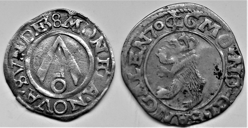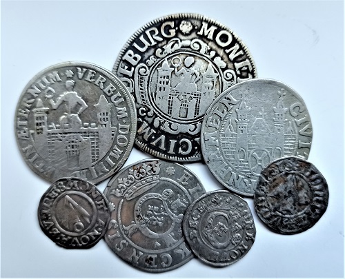 Silbermünzen aus Magdeburg, Stralsund, Einbeck und Hameln sind an ihren Wappen und an dem Buchstaben E gut zu erkennen.