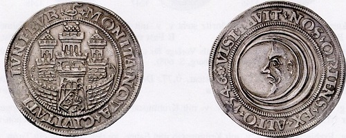 Die Ende des 15. Jahrhunderts aufkommende Talerprägung bot den Stempelschneidern mehr Spielraum, ihr Können zu entfalten, als es bisher bei den kleineren Gulden, Groschen und Pfennigen möglich war. Prächtige Wappenschilder wurden auf Münzen obligatorisch, und in vielen Fällen kann man vor allem bei städtischen Prägungen schon beim ersten Hinschauen sagen, woher sie kommen. So weisen die Magd über der Burg auf Magdeburg, das Mondgesicht auf Lüneburg (Lunaburg) und der dreifache Strahl auf Stralsund. Das aus einem Haus springende Schaf symbolisiert Schaffhausen, und auch die auf einer Kugel stehende Glücksgöttin Fortuna erinnert an die von den Dänen gegründete Stadt Glückstadt. Hinzu kommt die auf einem kleinen Berg sitzende Henne als Wappenzier der Grafschaft Henneberg, und auch im Falle der Münzen der elsässischen Stadt Thann ist die Zuordnung nicht schwer, wo eine Tanne als redendes Wappen fungiert.