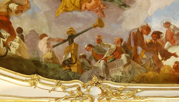 Ein prachtvolles Deckengemälde des italienischen Malers Gregorio Guglielmi in der Großen Galerie des Wiener Schlosses Schönbrunn verherrlicht den Wohlstand und das Wohlergehen der Monarchie unter der Herrschaft der Kaiserin Maria Theresia. Das figurenreiche Fresko von 1760 zeigt sie und ihren Gemahl Kaiser Franz I. Stephan und schildert, wie Münzen auf der Spindelpresse geprägt werden und die Bedeutung gut geordneter Geldverhältnisse.