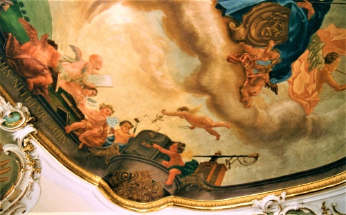 Das Deckengemälde in der früheren Münze im Günzburger Schloss schildert mit einer barocken Allegorie, wie sich niedliche Putten an einer Spindelpresse zu schaffen machen.