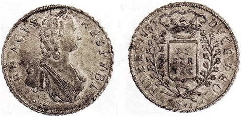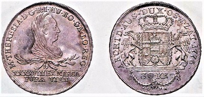 Das Dreißig-Kreuzer-Stück von 1776 wurde in Wien für das bei den Polnischen Teilungen an Österreich gefallene Kronland und Königreich Galizien und Lodomerien geprägt.
