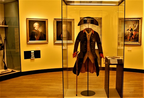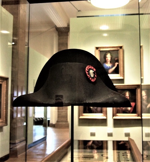 Auf dem Parcours begegnet man bekannten Persönlichkeiten gemalt oder in Stein gemeißelt wie Kaiser Karl dem Großen oder, vertreten durch Gemälde oder seine mit dem Adlerorden besetzte Uniform beziehungsweise Handschuhe dem preußischen König Friedrich II. In einer Vitrine ist auch der schwarze Filzhut ausgestellt, den der französische Kaiser Napoleon I. nach seiner vernichtenden Niederlage bei Waterloo 1815 zurückgelassen hat. Aus Hitlers Reichskanzlei stammt nicht nur ein riesiger Schreibtisch, sondern auch ein großer Globus mit einem Loch, durch das nach der Eroberung Berlins im Mai 1945 ein Rotarmist Deutschland von der Landkarte weggeschossen hat.