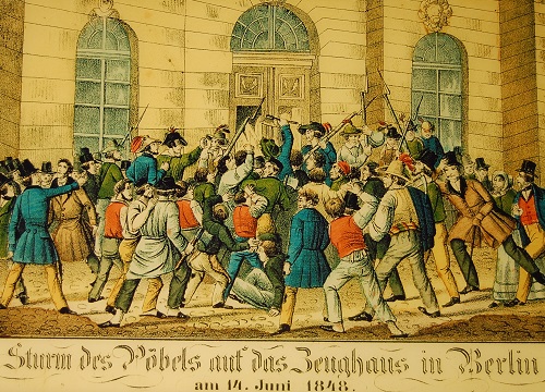 Erinnert sei, dass das Berliner Zeughaus in der Revolution von 1848 eine bedeutende Rolle gespielt hat und deshalb ein wichtiger Geschichtsort ist. Am 14. Juni 1848 erstürmten Arbeiter und Handwerker, empört über die nicht eingetretene Verbesserung ihrer Lebenslage und die Ignoranz des Königs, sich auf Herstellung verfassungsmäßiger Zustände einzulassen, das von Bürgerwehr und königlichem Militär besetzte Waffenarsenal. Friedrich Wilhelm IV. setzte seine Soldaten in marsch und ließ, wie am 18. März 1848, in den "Pöbel" schießen. In der Ausstellung ist auch davon die Rede, und es wird gezeigt, wie die Reaktion ab Sommer 1848 nach dem vom preußischen König Friedrich Wilhelm IV. ausgegebenen Parole "Gegen Demokraten helfen nur Soldaten" eine nach der anderen Position erobert und den Geist des 18. März tötet. Erst nach dem Ende der Monarchie 70 Jahre später konnten Forderungen von 1848 in die Weimarer Verfassung aufgenommen werden, und auch unser Grundgesetz enthält solche Elemente.
