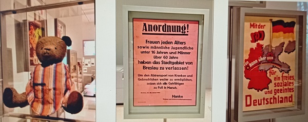 Einen Schwerpunkt der nach langen, kontroversen Diskussionen eröffneten Ausstellung bildet in der zweiten Etage das, was Deutsche bei ihrer Vertreibung nach dem Zweiten Weltkrieg erlitten haben und wie die zwangsweise, oft chaotisch verlaufende Aussiedlung, aber auch die Festlegung der deutschen Ostgrenze durch das Potsdamer Abkommen von 1945 das politische Klima vor allem in der jungen Bundesrepublik Deutschland bestimmte und trübte. Die Ausstellung unterstreicht, dass Ausgangspunkt allen mit den Zwangsmaßnahmen und territorialen Veränderungen verbundenen Leids einschließlich der vielen Todesopfer auf endlos langen Wegen in eine neue Heimat Hitlers Diktatur und der vom Deutschen Reich geführte Eroberungs- und Vernichtungskrieg war. In den heftigen Debatten um Heimat und Heimatvertriebene wurden diese Ursachen vielfach ausgeblendet. Tatsache ist, dass viele von ihnen begeistert die Hitlerdiktatur begrüßt und unterstützt hatten, ja auch in Verbrechen verwickelt waren, wovon sie aber nach dem Krieg nichts wissen wollten. Befürchtungen, das schreckliche Schicksal von Millionen in den Trecks mühsam laufenden, vielfach von ihren neuen Landsleuten abgelehnten Menschen könne das der von den Nationalsozialisten eroberten, ausgebeuteten und unterdrückten Länder in den Schatten stellen und auch Holocaust und Völkermord relativieren, erweisen sich als haltlos. Man muss sich nur die Zeit nehmen und die Exponate und Texte genau studieren.