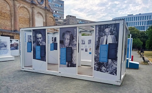 Die Ausstellung unter freiem Himmel schildert, was es für die von den Nationalsozialisten aus rassistischen und politischen Gründen verfolgten Menschen bedeutete, Hals über Kopf ihre Heimat und damit auch Freunde und Verwandte zu verlassen und in anderen Ländern eine neue Existenz aufzubauen. Die ins Exil vertriebene, von den Nazis zudem als "undeutsch" verteufelte Dichterin Mascha Kaléko fasste ihre Empfindungen und Ängste in diesem "Inventar" genannten, und in der Ausstellung nachzulesenden Gedicht so zusammen: "Haus ohne Dach / Kind ohne Bett, Tisch ohne Brot / Stern ohne Licht: // Fluss ohne Steg / Berg ohne Seil / Fuß ohne Schuh / Flucht ohne Ziel. / Dach ohne Haus / Stadt ohne Freund / Mund ohne Wort / Wand ohne Duft. // Brot ohne Tisch / Bett ohne Kind / Wort ohne Mund / Ziel ohne Flucht."