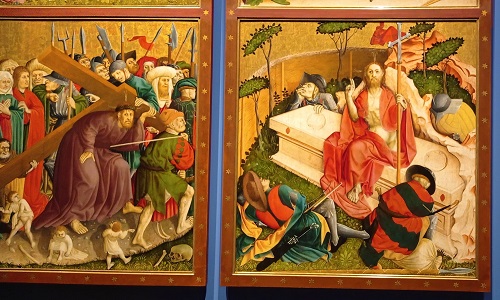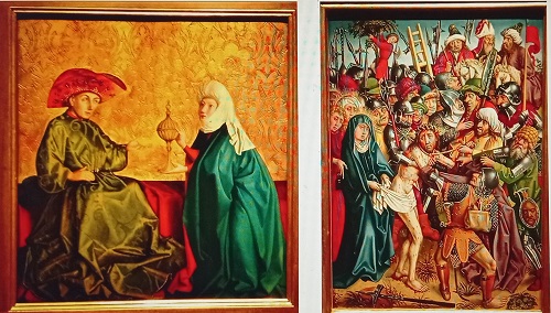 Die vom Germanischen Nationalmuseum Nürnberg nach Berlin entliehene "Die Verkündigung an Maria" von Konrad Witz beispielsweise zeigt die Muttergottes ganz unspektakulär in einem einfachen, unmöblierten Gemach lesend, in dem sich weder ein Stuhl noch ein Kissen oder ein Betpult befindet. Ihr verehrungswürdiger Stand wird lediglich durch den goldenen Heiligenschein und das blaue Gewand betont. Der gleiche Maler zeigt auf einem anderen Bild, wie die Königin von Saba den alttestamentarischen König Salomo besucht. Beide sind wie reiche Leute des 15. Jahrhunderts vor goldenem Hintergrund kostümiert. Die Szene bezieht sich auf das 1. Buch der Könige und das 2. Buch der Chronik. Dort wird erzählt, dass die Königin von Salomos Weisheit und dem Gerechtigkeitssinn überwältigt ist und ihm große Mengen Goldes sowie Spezereien (Gewürze, Delikatessen) und Edelsteine schenkt.