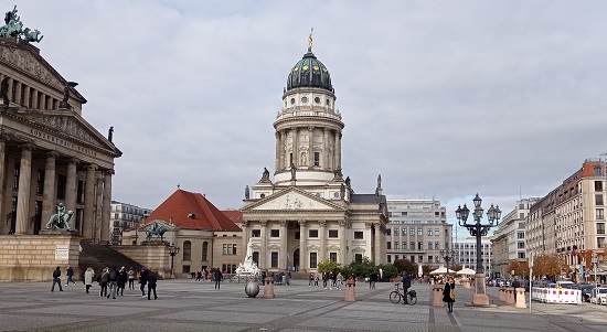 Die Französischen Friedrichstadtkirche, die besser unter ihrem Namen Französischer Dom bekannt ist, wird für Gottesdienste, Konzerte und Vorträge genutzt, und sie beherbergt die Evangelische Akademie zu Berlin sowie das Hugenottenmuseum und sein Archiv. Der Turm mit einer vergoldeten Kuppelfigur stammt aus der Zeit Friedrichs des Großen. Mit ihm und dem in der gleichen spätbarocken Form errichteten Turm der Deutschen Kirche, genannt Deutscher Dom, verlieh der Monarch um 1785 dem Stadtraum eine großartige Gestalt. Im frühen 19. Jahrhundert verband Schinkel beide Gotteshäuser durch das klassizistische Schauspielhaus, das heute Konzerthaus heißt.
