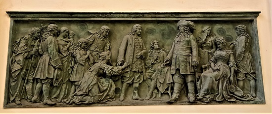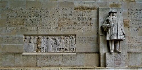Das Relief im Eingangsbereich des Hugenottenmuseums zeigt, wie man sich im späten 19. Jahrhundert die huldvolle Aufnahme der französischen Glaubensflüchtlinge 1685 durch Kurfürst Friedrich Wilhelm von Brandenburg vorstellte.