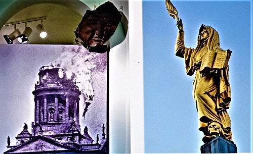 Im Hugenottenmuseum werden ein Foto des im Zweiten Weltkrieg brennenden Turms und ein Rest der vergoldeten Figur auf der Spitze gezeigt, die in den 1980er Jahren rekonstruiert und wieder aufgesetzt wurde.