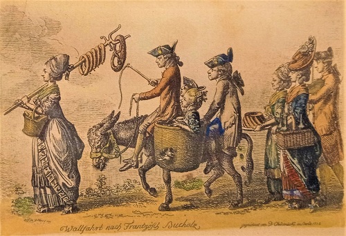 Leben und Werk des Maler und Grafikers Daniel Chodowiecki werden im Hugenottenmuseum ausführlich gewürdigt. Der Vielbeschäftigte war ein Familienmensch und hat sich auf der farbigen Grafik zeigt ihn und seine Familie bei einer "Wallfahrt nach Französisch-Buchholz", die allerdings 1775 ins Wasser fiel, weshalb der Künstler dieses Blatt zum Trost schuf.