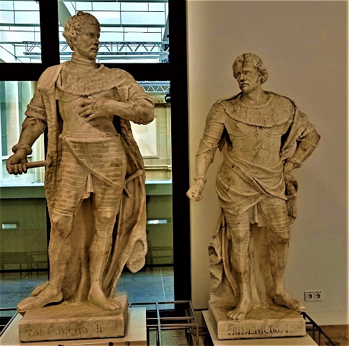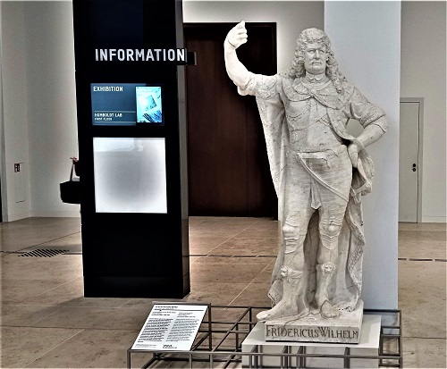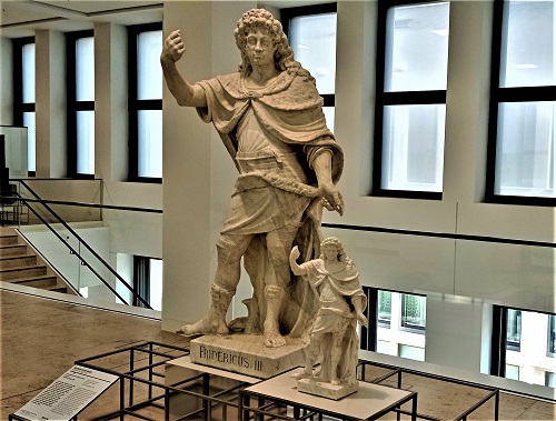 Der Bildhauer stellt einige Herrscher in "römischem Habit" dar, so wie wir es bei Andreas Schlüters Reiterdenkmal des Großen Kurfürsten Friedrich Wilhelm von Brandenburg im Ehrenhof des Schlosses Charlottenburg, einigen Generalsfiguren in der Kleinen Kuppelhalle des Bode-Museums oder beim Denkmal des Großen Kurfürsten Friedrich Wilhelm in Rathenow kennen. Die letzte von Eggers geschaffene Statue im Treppenhaus des Humboldt Forums ehrt Kurfürst Friedrich III., der 1688 seinem Vater Friedrich Wilhelm folgte, die Umwandlung des Berliner Schlosses in einen prächtigen Barockpalast veranlasste und sich 1701 als König Friedrich I. "in" Preußen krönte. Dass er ein schwacher Herrscher war, dem höfisches Zeremoniell und hohler Prunk wichtiger als das Wohl seiner oft in Elend und Armut vegetierenden Untertanen war, muss man sich beim Anblick dieser Marmorfigur hinzu denken.