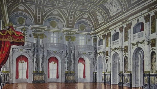 Die von Kaiser Wilhelm II. aus dem Weißen Saal des Stadtschlosses verbannten Marmorstandbilder erhielten nach 1945 Asyl in Prunkräumen des Potsdamer Neuen Palais, rechts der Marmorsaal.