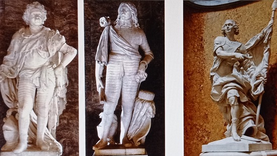 Im Schloss Oranienburg sind Marmordenkmäler des Kurfürsten und Königs Friedrich III./I. und des noch jungen Friedrich Wilhelm aufgestellt. Der Sohn und Nachfolger des Großen Kurfürsten und seiner Gemahlin Luise Henriette von Oranien lebte oft und gern im Oranienburger Schloss, das auf das Prächtigste ausgestattet war. Sein 1692 von Gabriel Grupello geschaffenes Denkmal aus Marmor war ursprünglich für Kleve bestimmt. Das von François Dieussart geschaffene Marmorstandbild des Großen Kurfürsten (rechts) stammt aus dem Jahr 1652 und schmückte ursprünglich ein Wasserbecken im Berliner Lustgarten. In der Kleinen Kuppelhalle des Bode-Museums schwingt der von Friedrich II., dem Großen, geschätzte und 1757 bei Prag tödlich verwundete, hier wie tanzend dargestellte Feldmarschall Kurt Christoph Graf von Schwerin tapfer die Fahne. (Fotos: Caspar)