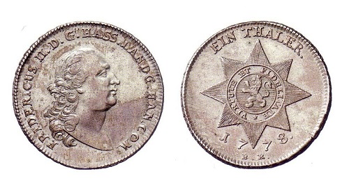 Die hessische Landmünze zu 24 Groschen mit dem Stern des vom Landgrafen gestifteten Hausordens ist in den USA als "Blooddollar" bekannt. In großen Mengen geprägt, dienten die Münzen als "Entschädigung" für jene Familien, deren Väter und Söhne für fremde Interessen verblutet waren. Deren letzte Hemden hatten keine Taschen, und ihre in der Ferne lebenden Angehörigen konnten an ihrem Grab nicht beten und weinen. Uns es war ihnen auch nicht möglich, nach altem Brauch den Toten etwas mitzugeben, damit es ihnen im Jenseits gut ergehe.