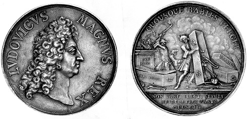 Das Heidelberger Schloss als Bollwerk der Pfälzer Dynastie wurde bis auf Mauerreste zerstört, außerdem haben die Franzosen alle Städte und Dörfer in der Rheinebene weitgehend dem Erdboden gleichgemacht. Heidelberg wurde 1688 und 1693 von französischen Truppen eingenommen und dabei komplett verwüstet. Die Soldaten plünderten, was ihnen in die Hände fiel, und sie scheute sich auch nicht davor, die Särge in der kurfürstlichen Gruft aufzubrechen und nach kostbaren Grabbeigaben zu durchwühlen. Die grausige Szene wird auf einer Medaille von 1693 mit dem Kopf von Ludwig XIV. geschildert. Eine andere Medaille zeigt unter dem Motto "Denck Deutschland an den Friedensbruch", wie sich französische Truppen über die Festung Philippsburg sowie Heidelberg und Koblenz hermachen und sich an der Bevölkerung vergehen. Weitere Medaillen dokumentieren die Beschießung und Einnahme von verschiedenen Städten wie Mainz und Bonn. Nicht immer haben sich die Bewohner verteidigt, manche Städte ergaben sich aus Angst vor Repressalien freiwillig. Allerdings wurde ihre Hoffnung auf Schonung und Milde häufig enttäuscht, denn es gehörte zur Kriegführung auf allen Seiten, den Gegner auszurauben und nur verbrannte Erde zu hinterlassen.