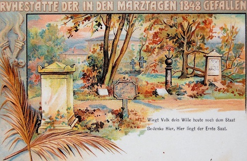 Bei seinen Friedhofsbesuchen bemerkt Rodenberg wohlgefällig, wie die Berliner liebevoll die Gräber pflegen und sie mit Blumen bepflanzen. "Es ist hierein schöner Gräberkult, der hier vor den Toren an den Sommersonntagen gefeiert wird. Nicht leicht zu finden sei der an der Landsberger Allee gelegene Friedhof der Märzgefallenen, die Begräbnisstätte der im März 1848 von preußischen Soldaten erschossenen Barrikadenkämpfer und - einige Jahre nach Rodenbergs Tod - der Opfer der Novemberrevolution von 1918 und der sich anschließenden Mordaktionen. "Den Soldaten, welche die Opfer dieser unseligen Kämpfe wurden, ist ein Nationaldenkmal errichtet worden im Park der Invaliden; dieser hier haben kein anderes Denkmal als halb eingesunkene Gräber und da und dort einen verwelkten Kranz. [...] Denn ohne Unterschied der Konfession ruhen die Toten hier, meist Männer aus den niederen und mittleren Ständen, Arbeiter jeder Art, Maschinenarbeiter, Kattundrucker, Buchdrucker, Buchhalter - nicht wenige darunter, die den Anfang der Zwanziger kaum überschritten."