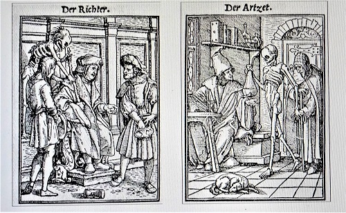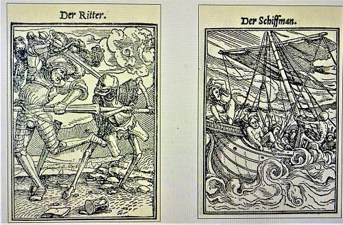 Das alles spielt sich nicht in imaginären Räumen ab, sondern in ihrer mal reichen, mal armseligen Lebensumwelt und immer in Kostümen des frühen 16. Jahrhunderts. Ob sie denn privilegiert sind und alle Reichtümer der Welt besitzen oder der Unterschicht angehören und ums tägliche Überleben kämpfen - alle diese Menschen können ihrem Ende nicht entkommen. Die in 1524 und 1525 nach Holbeins Vorlagen von dem in Basel tätigen Formschneider Hans Lützelburger geschaffenen Holzschnitte erschienen erstmalig im Jahre 1530 als Bildersammlung. Sie war so beliebt, dass man schon bald ein Buch daraus gemacht hat.