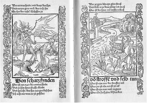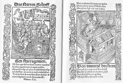 Große Verbreitung im In- und Ausland erreichte noch vor der Lutherschen Reformation dem "Narrenschiff" des Sebastian Brant (1457-1521) zuteil. Der Professor für Rechtswissenschaft an der Universität Basel beziehungsweise Stadtsyndikus und Kanzler in Straßburg war einer der produktivsten Autoren lateinischer Andachtslyrik und trat auch als Herausgeber von antiken Klassikern und Schriften italienischer Humanisten in Erscheinung. Sein 1494 in Basel veröffentlichtes Werk "Das Narrenschiff" kennzeichnet ihn als herausragenden Vertreter des Humanismus. Die in Basel von Johann Bergmann von Olpe gedruckte Spruchdichtung mit über einhundert von keinem Geringeren als dem jungen Albrecht Dürer und anderen Künstlern geschaffenen Holzschnitten avancierte um 1500 zu dem wohl erfolgreichsten deutschsprachige Volksbuch dieser Art.