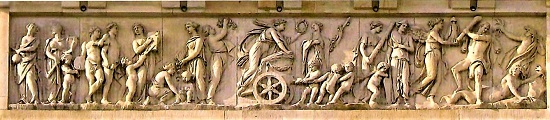 Das auf einem Großfoto in der Werkstatt und in einer Publikation des Deutschen Bundestags gezeigte Relief "Einzug der Friedensgöttin im Triumphwagen" auf der Attika des Säulenbaus feiert unterhalb der Quadriga mit allegorischen Figuren den königlichen Bauherrn als Friedensfürsten. Es schildert auf der rechten Seite die Schrecken des Krieges und auf der linken Seiten die Segnungen des Friedens und das Aufblühen der Künste unter Friedrich Wilhelm II. mit Symbolen der Architektur, Bildhauerei und Malerei sowie der Musik und Dichtkunst.
