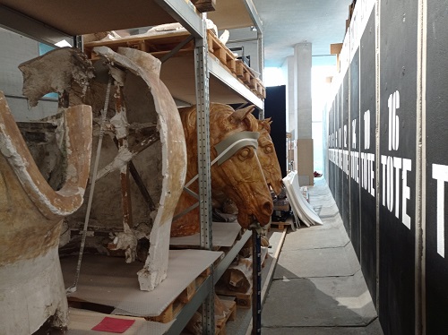 Hinter den Mauersegmenten sind in Regalen Einzelteile der Gipskopien von 1957/8 aufgestellt.