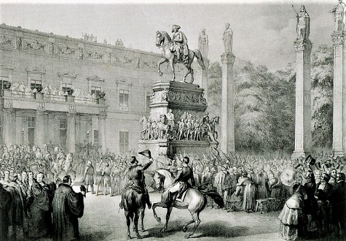 Eines der berühmtesten Reiterdenkmäler des 19. Jahrhunderts feiert den preußischen König Friedrich II., den Großen, Unter den Linden in Berlin. Am 31. Mai 1851 ertönten Kommandos, die Herren legten die Hand an den Helm, die Militärkapelle spielte einen Marsch. Als lange Tücher gefallen waren, gab es Jubel für das Monument, das nach einer quälend-langen Vorgeschichte nun endlich fertig gestellt war. Glaubt man dem Satireblatt "Kladderadatsch", dann waren der königliche Hof und die Spitzen der Berliner Gesellschaft bei der Enthüllung des von Christian Daniel Rauch unter Zuhilfenahme weiterer Künstler geschaffenen Denkmals ganz unter sich. Das Journal veröffentlichte folgendes Spottgedicht: "Der König rief! - es sank die Emballage, / Und frei von jeder Hülle strahlte die Visage / Des Mannes, der durch Geist wie durch Courage / In der Geschichte wohnen wird stets Bel-Etage! / Doch leider, ach! Gesperrt war die Passage / Für uns, die wir gehören zur ,Bagage'! / Und da wir meiden gern Carambolage / So blieben wir -o schreckliche Blamage! - / Ruhig zu Haus' in unserer Menage / In einer Sprache, wie bekanntlich sie Usage / Beim ,größten König' und beim Kladderadage." Auch bei folgenden Grundsteinlegungen, Denkmalsenthüllungen und der Weihe großer öffentlicher Gebäude blieb die "Bagage" draußen in demütiger Erwartung dessen, was die Obrigkeit und die Künstlerschaft da geschaffen haben.