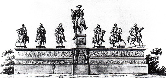 Die Vorgeschichte des Monuments reicht ins späte 18. Jahrhundert zurück, als man in Preußen, und nicht nur dort, dem "Alten Fritzen" große Verehrung entgegenbrachte. Dieser verbat sich, dass man ihm zu Lebzeiten Denkmäler unter freiem Himmel errichtet, denn nur ein toter Monarch oder Feldherr sei dieser Ehre würdig. Dessen ungeachtet reimte zu seinen Lebzeiten der Dichter Karl Wilhelm Ramler in einer Ode an die Stadt Berlin: "Eilt, ihn in Erz den Enkeln aufzustellen. / Eilt, einen Tempel ihm zu weihn", als gelte es, einen Gott zu ehren. Und so planten Architekten und Bildhauer gigantische Totentempel, überkuppelte Särge und Gedächtnishallen. Alle diese Monumente einschließlich einer Trajanischen Säule, wie sie in Rom steht, mit dem Standbild des Königs obenauf, wurden nicht verwirklicht.