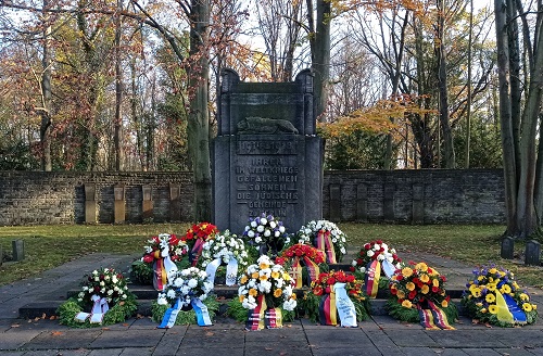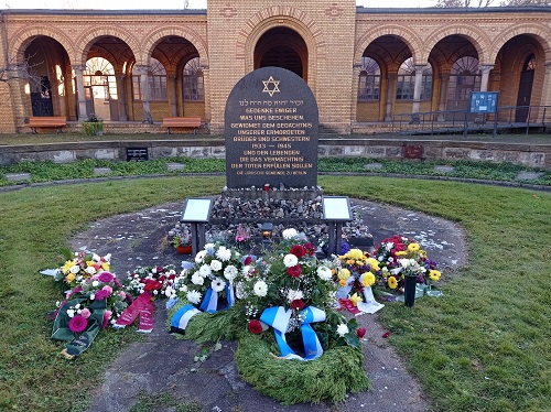 Vor dem von Alexander Beer gestalteten und 1927 eingeweihten Mahnmal im hinteren Teil des Friedhofs für die im Ersten Weltkrieg gefallenen Mitglieder der Jüdischen Gemeinde zu Berlin liegen Kränze, die am Volkstrauertag 2022 in ehrendem, die Opfer des Holocausts einschließendem Gedenken niedergelegt wurden. Das drei Meter hohe Denkmal aus Muschelkalkstein ist wie ein monumentaler Altar gestaltet. Im Umkreis fanden auf einem Ehrenfeld zwischen 1914 und 1918 gefallenen Soldaten ihre letzte Ruhe.