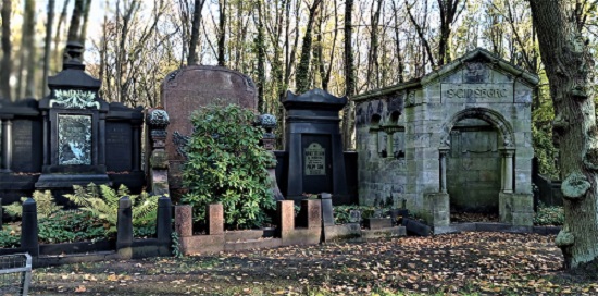 An einzelnen Wegen und Rondellen aufgestellte Grabmäler in ihren historisierenden Formen und kostbaren Materialien von wirtschaftlicher Potenz und gesellschaftlicher Stellung der hier