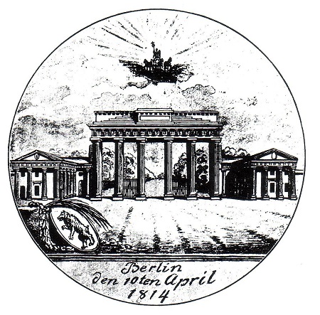 Die in Einzelteile zerlegte Quadriga wurde, in zwölf Kisten verpackt, auf dem Wasserweg über Hamburg nach Paris gebracht. Der Plan des Kaisers, sie auf einen Triumphbogen zu stellen, blieb unausgeführt. Stattdessen hat man sie im Erdgeschosssaal des Musée Napoléon aufgestellt, nachdem die nicht unerheblichen Schäden behoben worden waren, wie Eckardt schreibt (3). Die triumphale Rückführung der Quadriga im Sommer 1814 nach dem Sieg der Verbündeten über Frankreich nach Berlin und auf das Brandenburger Tor war dem mit Äußerungen über eigene Befindlichkeiten sparsamen Schadow nur diese Bemerkung wert: "Am 30sten [Juni 1814, H. C.] war auf demselben Tore, durch den Mechaniker Hummel aufgestellt, wieder zu sehen die Quadriga" (4). Das von König Friedrich Wilhelm III. 1813 gestiftete und von Karl Friedrich Schinkel als Kriegs- und Zivilauszeichnung gestaltete Eiserne Kreuz wurde in den Eichenkranz an der Stange eingefügt, womit die Friedensgöttin Eirene in die Siegesgöttin Viktoria verwandelt wurde. Bei der Neuaufstellung der wiederhergestellten Quadriga haben die DDR-Behörden 1958 das ihnen verhasste Eiserne Kreuz samt aufliegenden Preußenadler entfernen lassen, weshalb der Kranz bis nach dem Fall der Berliner Mauer und der Öffnung des Brandenburger Tors leer blieb. Erst im Zusammenhang mit der Restaurierung der in der Neujahrsnacht vom 31. Dezember 1989 zum 1. Januar 1990 von feiernden Berlinern demolierten Figurengruppe konnte der historische Zustand wiederhergestellt werden.