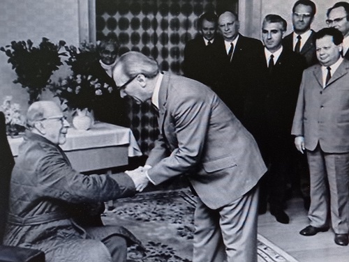 Das auch in der DDR-Presse veröffentlichte, also von der Zensur gewollte Foto zeigt, wie das SED-Politbüro dem gerade geschassten Politiker am 30. Juni 1971 zum 78. Geburtstag gratuliert. Im Morgenmantel sitzt der ehemals als Baumeister des Sozialismus verherrlichten SED- und Staatschef mit Hauslatschen an den Füßen in einem Sessel. Erich Honecker beugt sich zu ihm herunter, die Gäste einschließlich Ulbrichts Frau Lotte im Hintergrund schauen betreten drein. Ob sich die Komödie im Haus am Döllnsee absoiuelte, müsste noch geklärt werden.