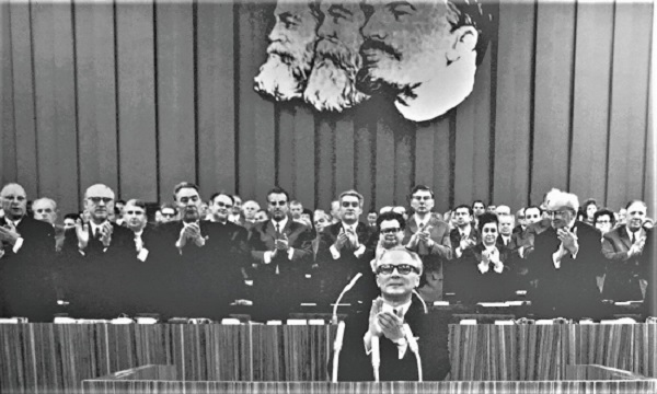 Auf dem VIII. Parteitag der SED im Juni 1971 beklatschte Erich Honecker sich und seinen durch Intrigen und Schmähungen erzielten Sieg über Walter Ulbricht, den er auch seinem "großen Bruder" Leonid Breshnew (in der ersten Reihe 3. von links) verdankte. (Foto/Repros: Caspar)