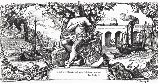 Die Allegorie auf die technischen Errungenschaften des 19. Jahrhunderts ehrt König Ludwig I. von Bayern, der sich der Eisenbahn der Dampfschifffahrt aufgeschlossener zeigte als andere Fürstlichkeiten seiner Zeit und auch die Eisenbahnstrecke von Nürnberg nach Fürth genehmigt hatte.