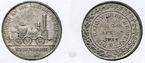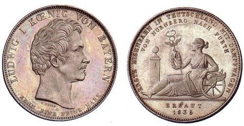 Es verwundert nicht, dass 1835 ein bayerischer Geschichtstaler mit dem Kopf von Ludwig I. sowie der Bavaria geprägt wurde, die sich lässig an ein Flügelrad lehnt. Das Symbol des Eisenbahnwesens ist auf vielen einschlägigen Prägungen zu finden.