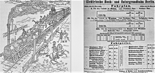 Die ersten Eisenbahnfahrten wurden noch mit offenen Wagen angeboten, wie die Passagiere hinterher aussahen, kann man sich angesichts des Qualms gut vorstellen. Was Fahrten mit der Berliner Hoch- und Untergrundbahn kosten, steht im Fahrplan von 1902.