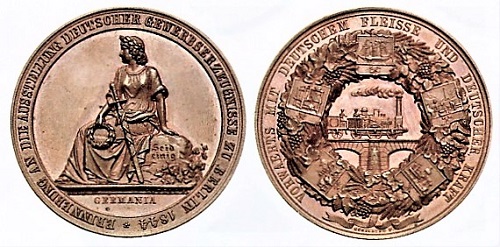 Eine zur Berliner Gewerbeausstellung von 1844 geprägte Medaille verbindet Germania mit Symbolen des Industriezeitalters und zeigt in der Mitte eine Lokomotive auf einer Brücke. Die Jungfernfahrt der Saxonia von Leipzig nach Dresden war 1839 die Prägung einer Medaille wert. (Fotos/Repros: Caspar)