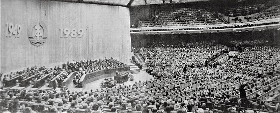 Bei der Festveranstaltung zum 40. Jahrestag der DDR am 7. Oktober 1989 im Berliner Palast der Republik haben sich Honecker und Genossen die Lage schön geredet und sich Mut gemacht, während der "Kessel" draußen im Lande zu explodieren drohte. Ein paar Tage später war Festredner Erich Honecker weg vom Fenster.