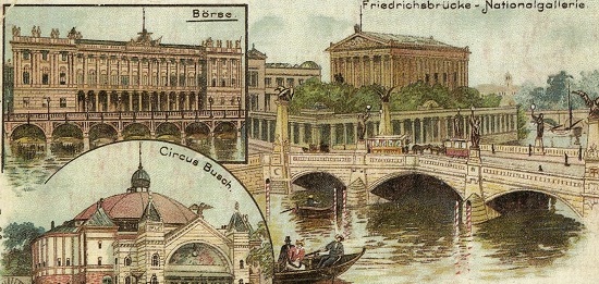 Die Reichshauptstadt schmückte mit Prunkbauten aller Art wie hier die Börse und die Nationalgalerie, aber auch mit dem Zirkus Busch und weiteren Vergnügungsetablissements. Armen Leuten fehlte das Geld für den Besuch.