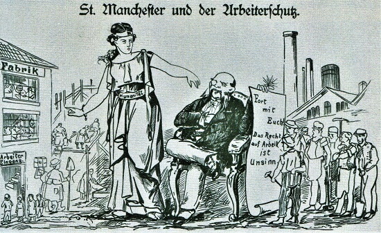 Den reichen Fabrikherren sind die Nöte ihrer schlecht bezahlten Arbeiter und Arbeiterinnen völlig schnuppe, und Arbeitsschutz ist für sie ein Fremdwort, gibt die Karikatur im Süddeutschen Postillon von 1885 zu verstehen. (Fotos/Repros: Caspar)
