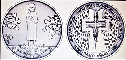 Die Münze zu fünf Grivna von 2007 zeigt das Denkmal in Kiew mit dem Mädchen, das Korn in Händen hält und den Hungertod erleiden wird. (Repros: Caspar)