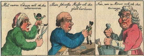 In Deutschland war es ein Wagnis, sich gegen den Kaiser der Franzosen in Bild und Schrift aufzulehnen, denn viele Fürsten waren ihm durch viele Vergünstigungen und Landgewinn verpflichtet. Wer Napoleon "zum Fressen gern" hatte und seine Abscheu aussprach, musste mit empfindlichen Strafen rechnen. Nach den Befreiungskriegen von 1813 bis 1815 bestand in dieser Hinsicht keine Gefahr mehr.
