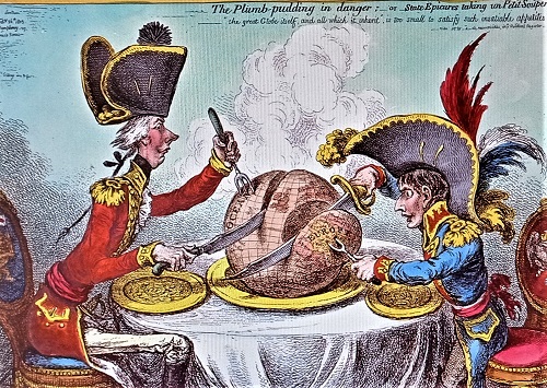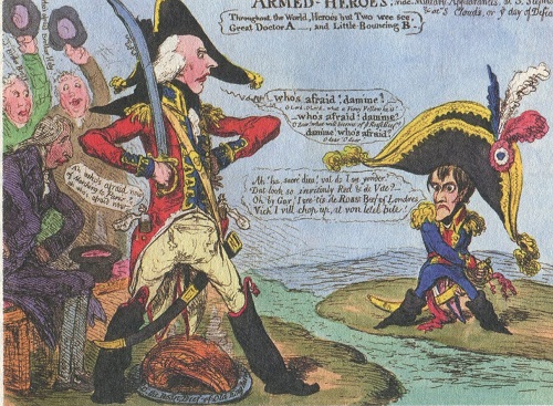 Die besonders drastischen Karikaturen von James Gillray und Isaak Cruikshank zeigen, wie "Little Boney" mit den Briten die Welt aufteilt und der Kaiser der Franzosen nicht über den Ärmelkanal kommt.