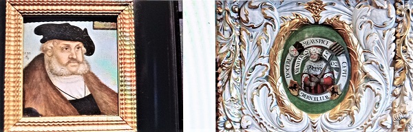 Kurfürst Friedrich der Weise, dargestellt auf einem Gemälde von Lucas Cranach und auf dem einem barocken Universitätskatheder, das in der Wittenberger Lutherhalle ausgestellt ist, nahm Martin Luther unter seine Fittiche.